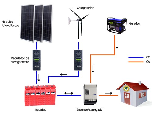 Um sistema autónomo deste tipo é constituído por um ou mais geradores de energia, que são tipicamente painéis fotovoltaicos que captam a energia do sol, ou sistemas híbridos com aerogerador. Através de um regulador de carregamento a energia eléctrica é carregada para as baterias, onde é armazenada até ser necessária. Para poder ser consumida, a electricidade é retirada da bateria e convertida de corrente contínua (CC) para corrente alternada (CA) através do inversor de corrente. Deste modo é possível o uso de electrodomésticos convencionais, de forma análoga à energia eléctrica proveniente da rede de energia pública.